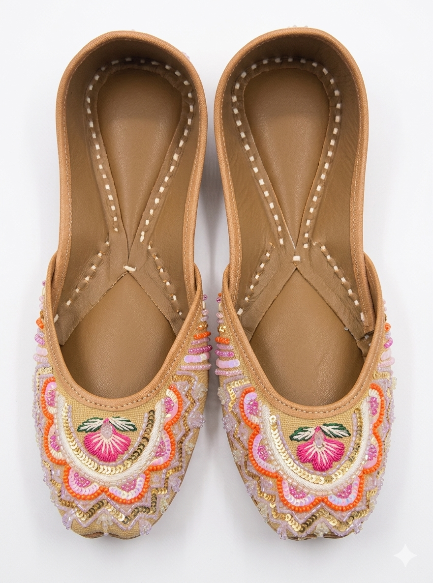 THIS handcrafted jutti is a vibrant fusion of traditional Punjabi heritage and contemporary pastel aesthetics. It is built on a foundation of supple, premium tan leather, meticulously designed to offer a balance of durability and artisanal elegance.