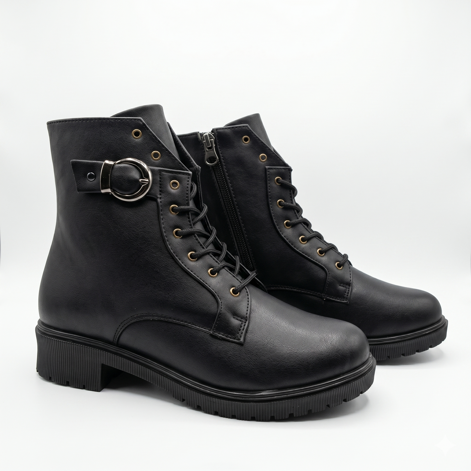 Take a step towards effortless style with our premium matte combat boots. Meticulously designed for the modern woman on the move, these boots are an essential staple for your transitional wardrobe. The matte black leather-style upper provides a sophisticated tactile finish, making them a perfect companion for everything from rugged street fashion to refined city looks.