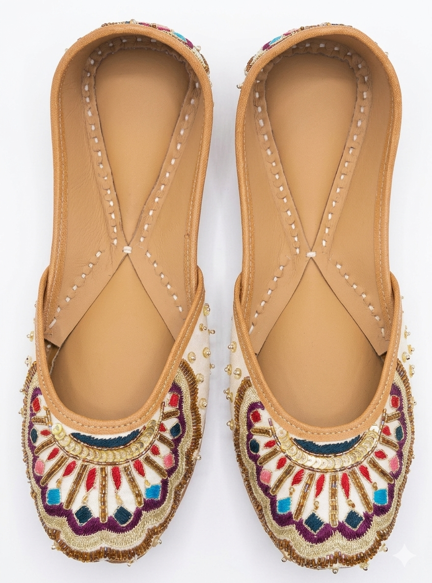 STEP into elegance with our Royal Mughal Jutti, a celebration of classic Indian craftsmanship. This exquisite pair is built on a luxurious pure silk base, meticulously hand-decorated with shimmering Zari thread work and delicate Sippy (sequin) accents. The fan-style motif on the toe creates a grand, traditional silhouette that adds a touch of royalty to any festive attire.